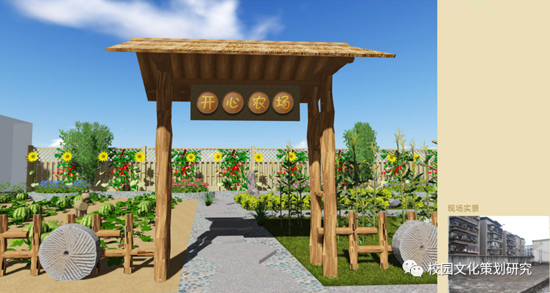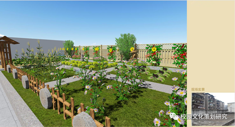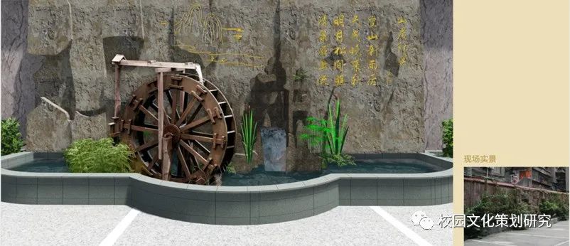 學(xué)校堡坎前面的樹(shù)池單一、凌亂,我們在保留原有樹(shù)池的基礎上,將堡坎墻壁設計成假山形式,樹(shù)池中蓄水并放置一架小水車(chē),山水結合,自然清新。
