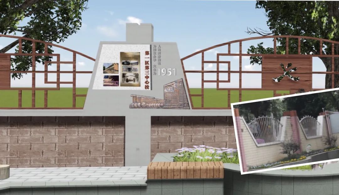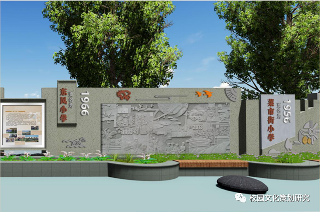 原有的圍墻造型單一、墻面凌亂,給人陳舊的感覺(jué),改造后的圍墻用幾何圖形進(jìn)行創(chuàng )意,從右至左直觀(guān)展現學(xué)校厚重的歷史文化底蘊。