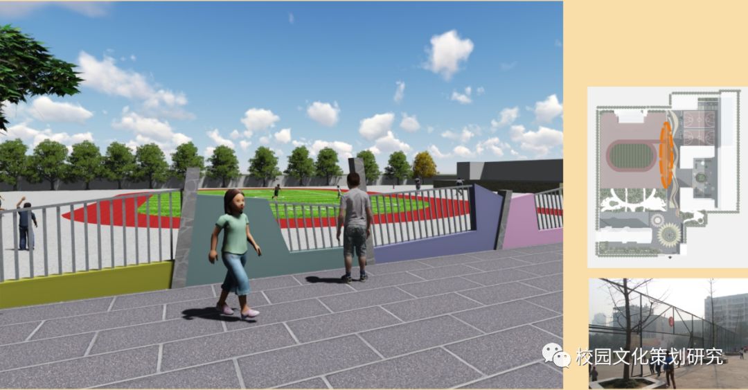 原有的運動(dòng)場(chǎng)欄桿是普通的圍網(wǎng),不具有美觀(guān)性,改造后的欄桿用幾何圖進(jìn)行創(chuàng )意、創(chuàng )造出只屬于我們的記憶墻。造型別致、色彩艷麗。更符合“兒童文學(xué)校園”的定位,只屬于孩子的這個(gè)世界。