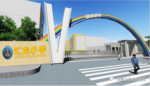 校門(mén)是一個(gè)學(xué)校的門(mén)面,大門(mén)之上的彩虹象征夢(mèng)想之門(mén),學(xué)生每天經(jīng)過(guò)此處都在成長(cháng)、蛻變,終有一天會(huì )實(shí)現自己的夢(mèng)想。左邊一個(gè)大寫(xiě)的V字,是victory(成功)的首寫(xiě),也是一本兒童文學(xué)名著(zhù)的造型。將標志的延展圖案運用于校門(mén)設計之中,第一眼便給人留下深刻印象。