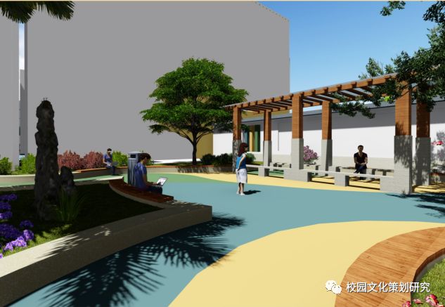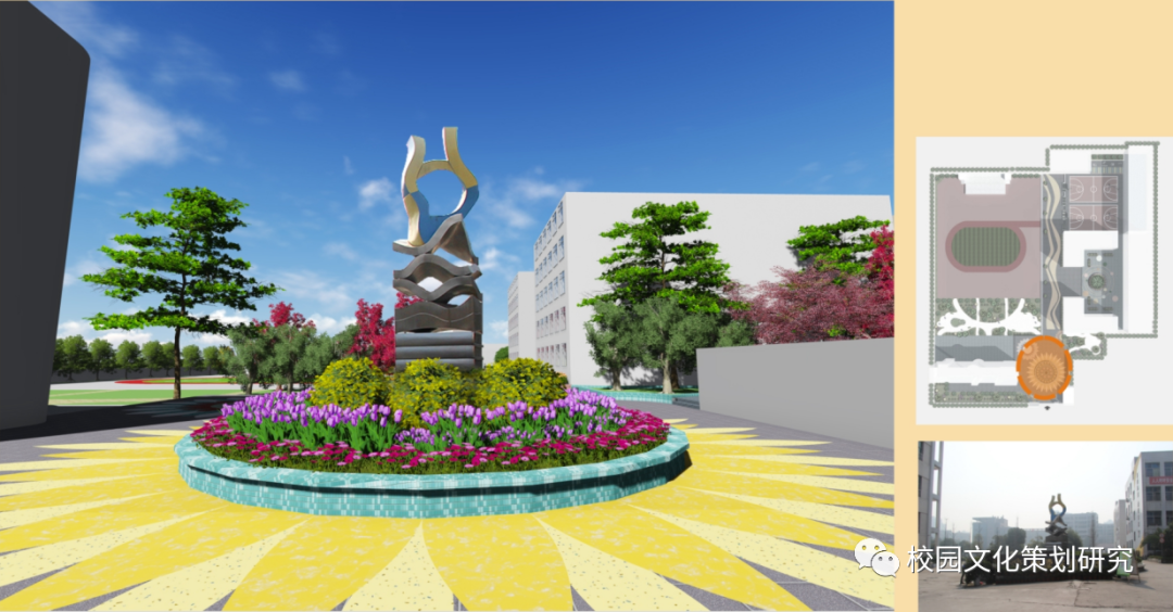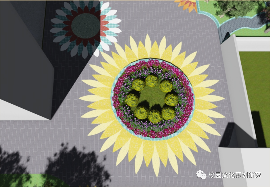 主廣場(chǎng)景觀(guān)在保持原有雕塑的基礎上,以雕塑為中心向外鋪裝改造,從空中看就像盛開(kāi)的鮮花,彰顯了學(xué)校“夢(mèng)想開(kāi)花”的環(huán)境文化主題,寓意兒童的夢(mèng)想終會(huì )開(kāi)花、結果。