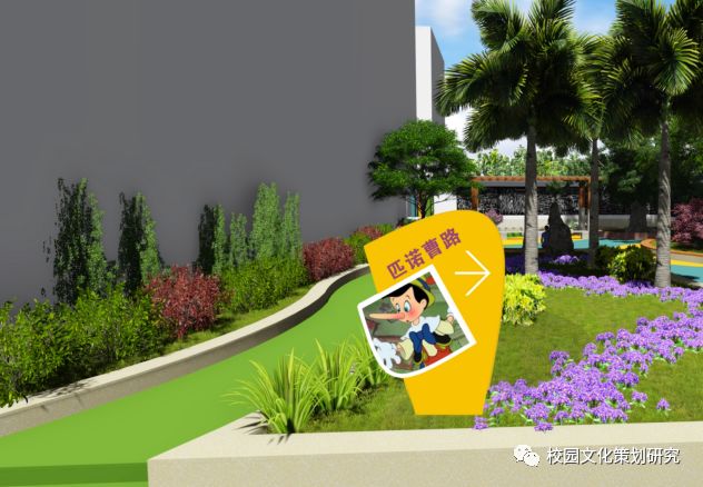 路名和路名牌設計與學(xué)校特色相融合,以?xún)和膶W(xué)人物為創(chuàng )意來(lái)源,活潑青春,色調明亮,讓人印象深刻。