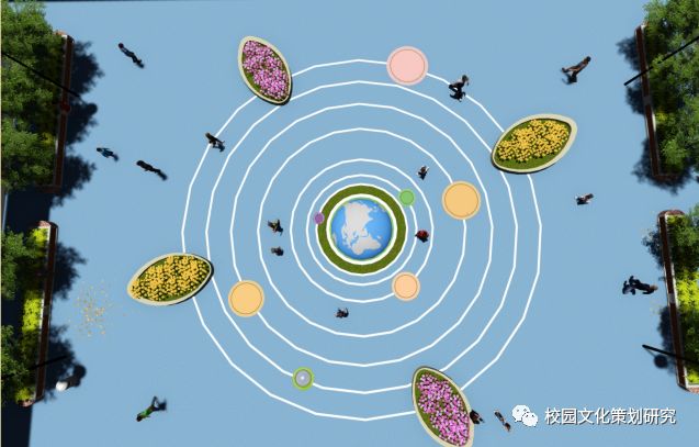 宇宙浩瀚,銀河璀璨,設計師在中庭以地球、銀河為創(chuàng )意設計了“明日世界”景觀(guān)。從空中鳥(niǎo)瞰,以地球為中心向外擴散,給人大氣、科幻之感。學(xué)生從此處經(jīng)過(guò),或可暢想未來(lái)世界,激發(fā)其學(xué)習興趣。