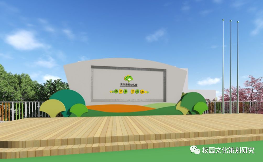 校門(mén)增加了門(mén)頭及保安亭設計,展現幼兒園標志和園名,左方是LED公告屏。大門(mén)上還融入了“新芽”圖形,突出該園的核心主題。