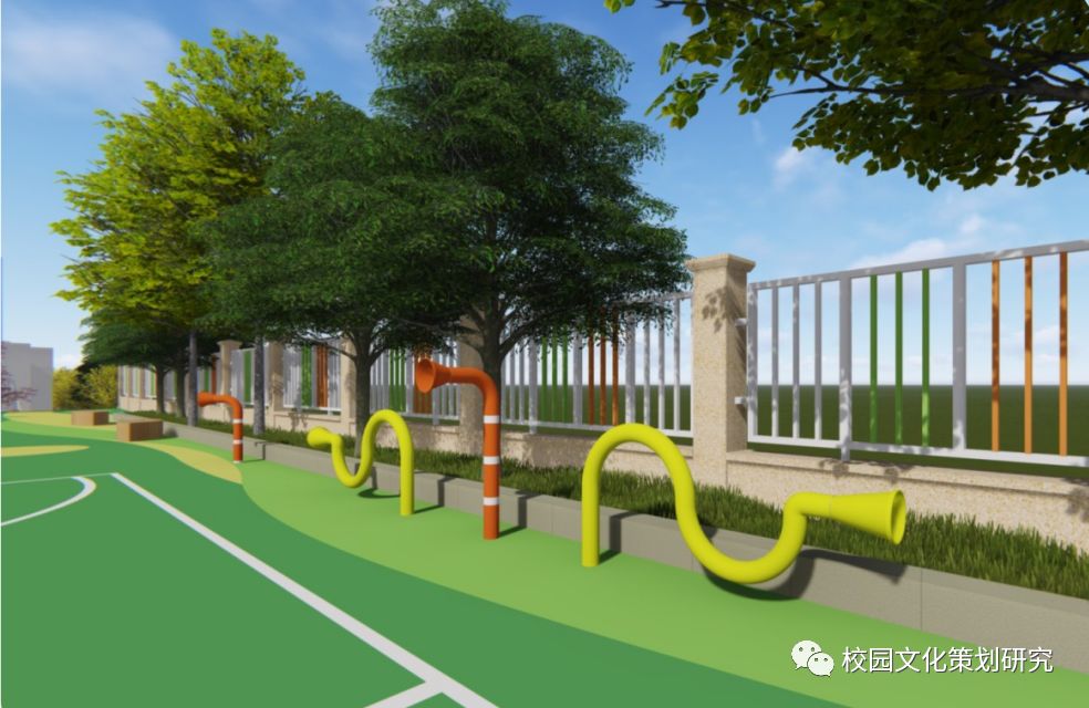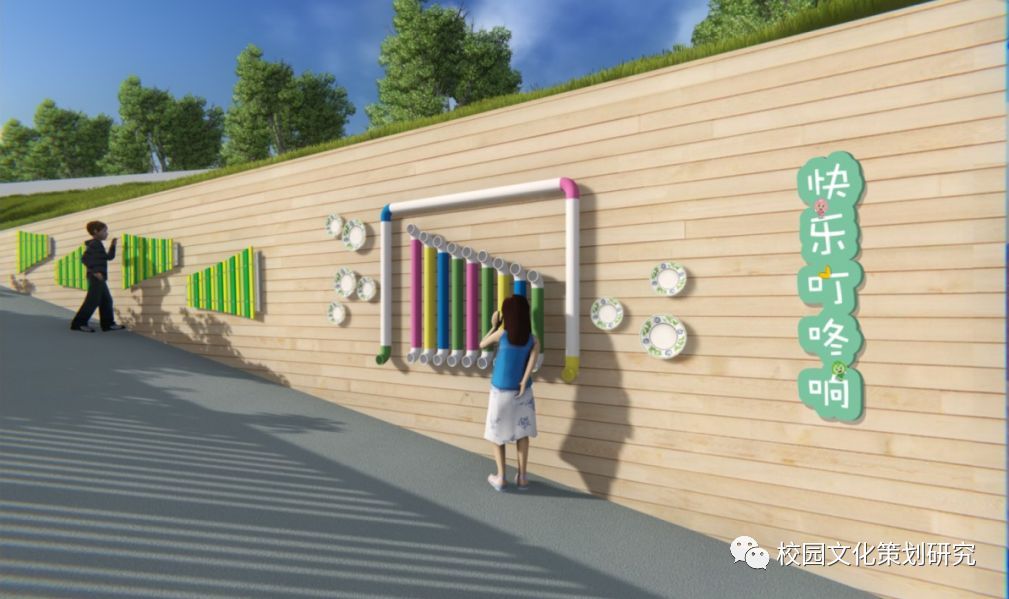 “森林小伙伴”文化景觀(guān)展示自然界生命的和諧共生;上坡斜面的墻上是以“快樂(lè )叮咚響”為主題的互動(dòng)樂(lè )器,讓孩子感受不同材質(zhì)敲打出來(lái)的聲音的魅力;“傳聲筒”則是讓孩子感受聲音的來(lái)源,增強他們“聽(tīng)聲音”的能力。