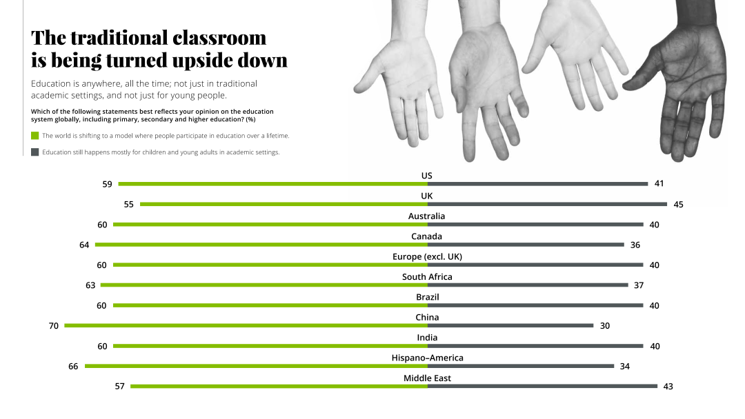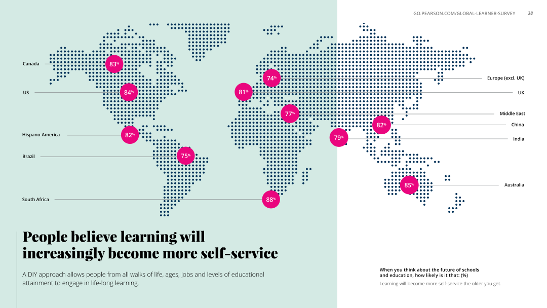 調(diào)查發(fā)現(xiàn):世界各地的學(xué)習(xí)者仍然對教育抱有很大的信心,他們期待教育能夠幫助自己取得成功。但是,他們獲得教育的方式正在改變,他們不再完全依賴于傳統(tǒng)的教育機(jī)構(gòu),而是更愿意對自身教育采取“DIY”的方式,除此之外,學(xué)習(xí)者都表達(dá)出終身學(xué)習(xí)的意愿。
