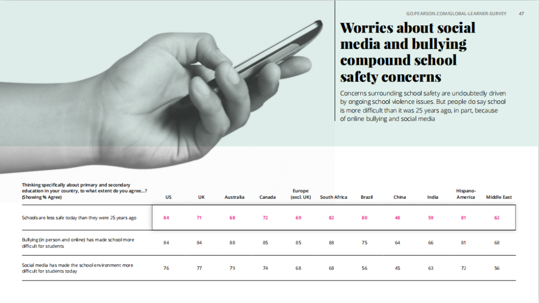調(diào)查結(jié)果顯示,現(xiàn)如今社交媒體和校園暴力加劇了學(xué)校安全問題的發(fā)生,84%的美國人認(rèn)為學(xué)校安全性遠(yuǎn)低于25年前,學(xué)校管理也變得極為困難。