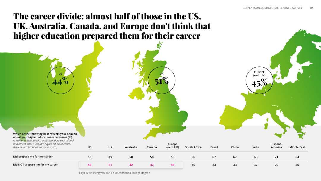 許多國家的工作者開始選擇除高等教育外的其他學(xué)習(xí)途徑 ,以期掌握新的技能,通過參加短期課程、雇主或?qū)I(yè)協(xié)會提供的進(jìn)修課程、學(xué)位課程或自學(xué)來提高自己的技能。接近一半的英國受訪者表示會重新考慮是否接受傳統(tǒng)高等教育的決定,高等教育并不能有效的幫助他們做好就業(yè)準(zhǔn)備。