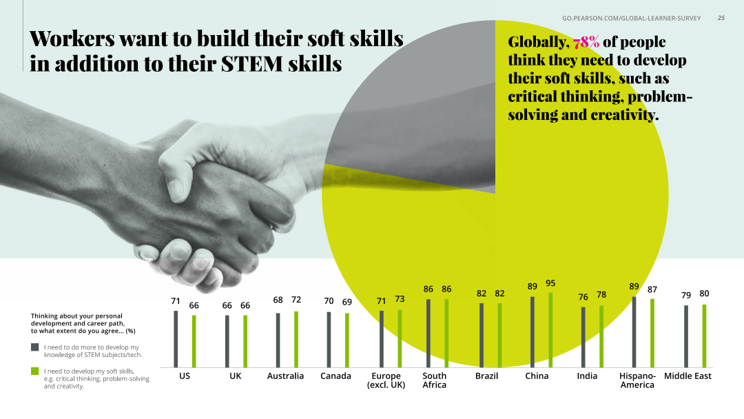 雖然STEM教育技能備受矚目,但人們逐漸意識到:人類獨(dú)有的人際技能將使人類優(yōu)于人工智能。如創(chuàng)造力、獨(dú)創(chuàng)性、解決問題和批判性思維等軟技能。許多受訪者提出大學(xué)需要更加專注于這些軟技能,為學(xué)生進(jìn)入職場做好充分準(zhǔn)備。
