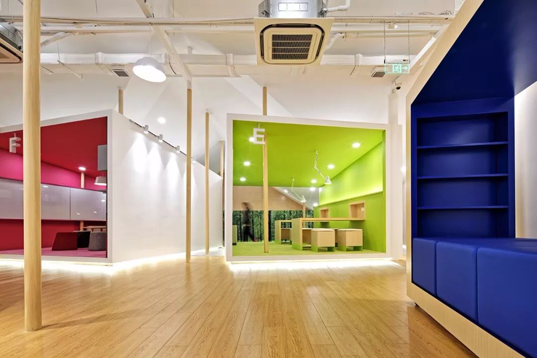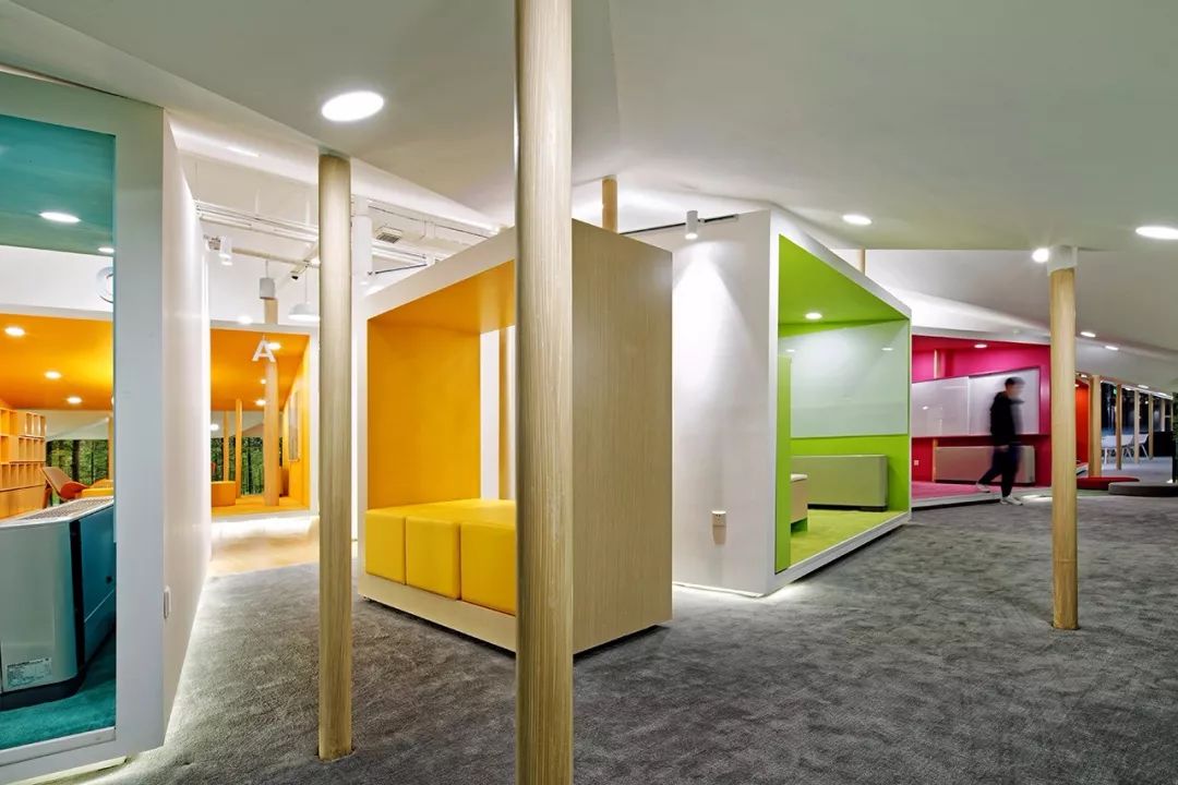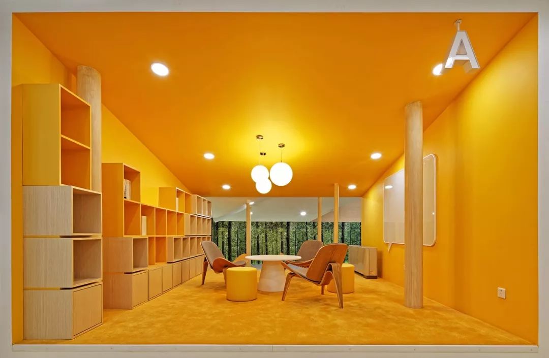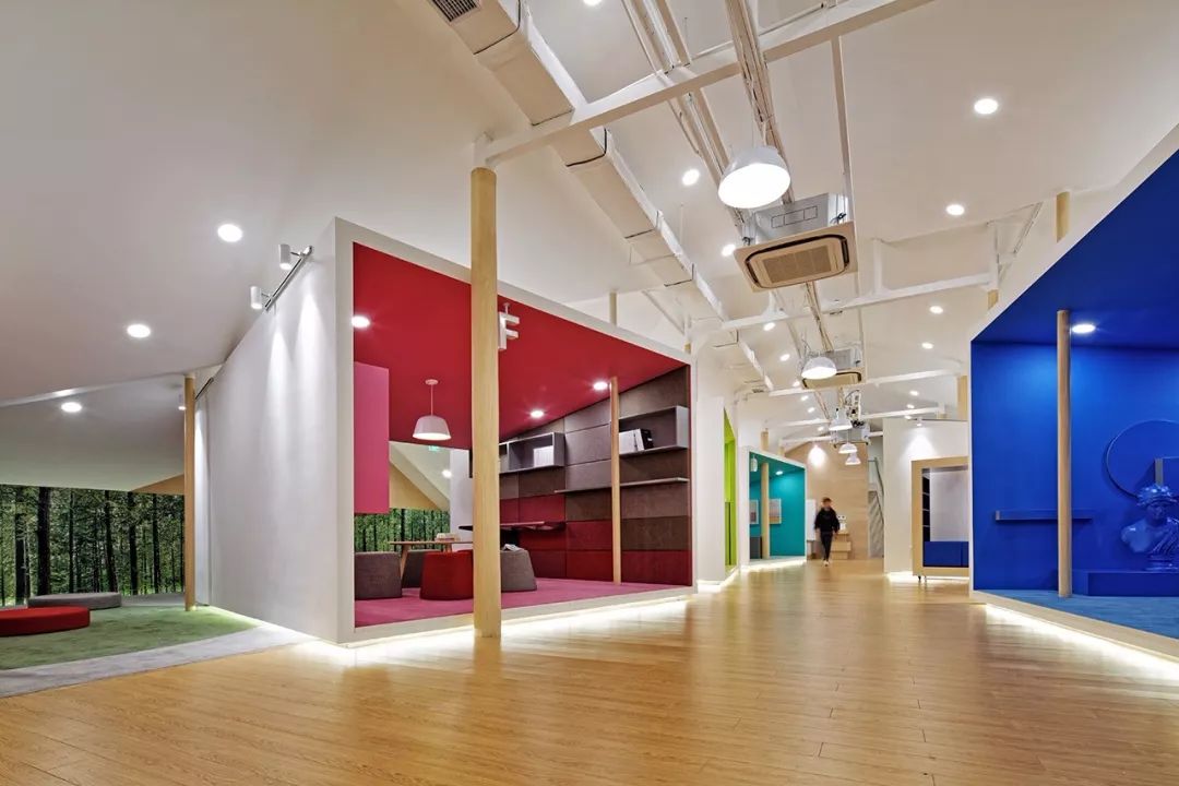 每一個盒子都用一種不同的鮮活顏色來標識,將學(xué)生們帶入一個個不同的創(chuàng)意靈感空間??臻g里又采用不同幾何元素的功能裝置及家具,從而形成色彩與形態(tài)多重組合的多維環(huán)境來激發(fā)學(xué)生們的創(chuàng)意與探索熱情。