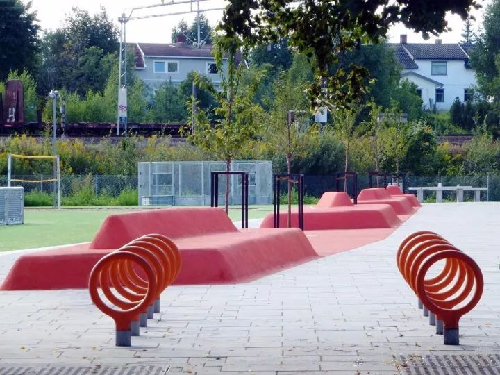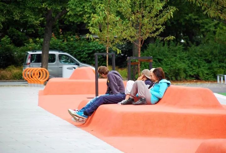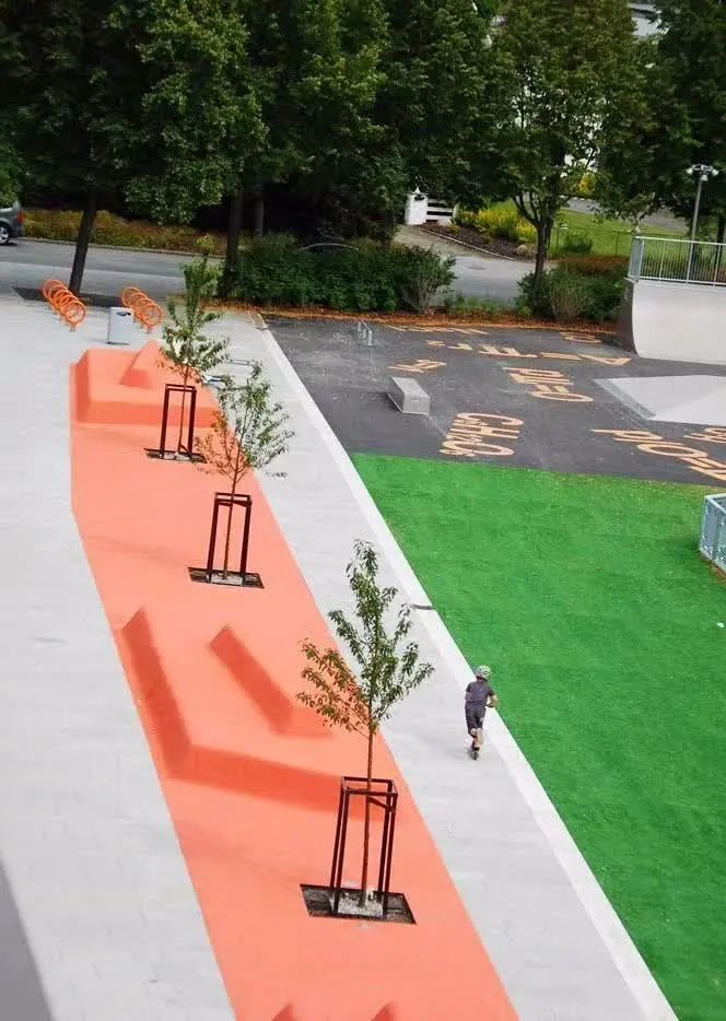 學(xué)校的中心有一長(zhǎng)條狀,用亮橙色橡膠瀝青澆筑的供學(xué)生們休息學(xué)習(xí)的構(gòu)筑物,不僅可被用作學(xué)習(xí)和交流的戶(hù)外露天教室,也可當(dāng)作旁邊運(yùn)動(dòng)場(chǎng)地的看臺(tái)。