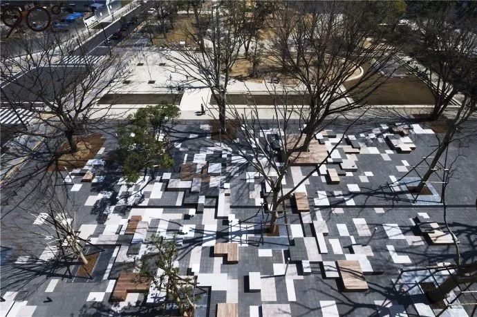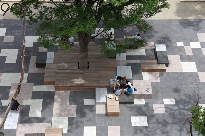 相信大家對(duì)這個(gè)案例并不陌生,打眼的鋪裝設(shè)計(jì),讓人一眼就忘不了。大小不一的方形設(shè)計(jì),是鋪裝,也是座椅,在黑與白的石材和木甲板中游弋。
