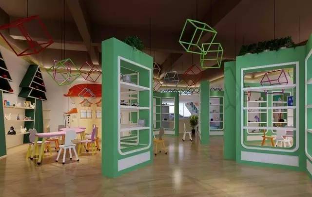 在作品展示區(qū),以不規(guī)則的展柜來(lái)分割區(qū)域,吊頂以不同的幾何體來(lái)裝飾,激發(fā)孩子的想象空間。