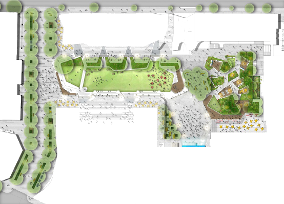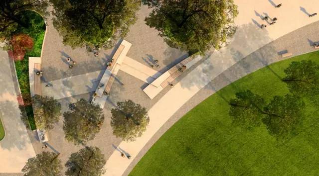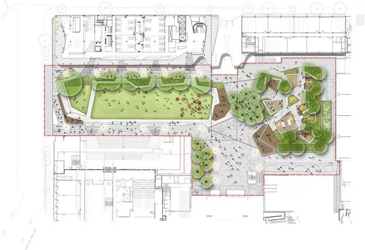 從平面圖上我們可以看出空間開合有致,有大草坪空間,也有交流洽談的小空間??墒枭⒋罅咳肆?,同時(shí)也為少數(shù)人群提供停留休憩點(diǎn)。