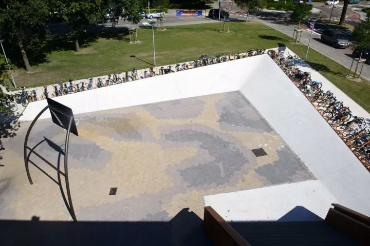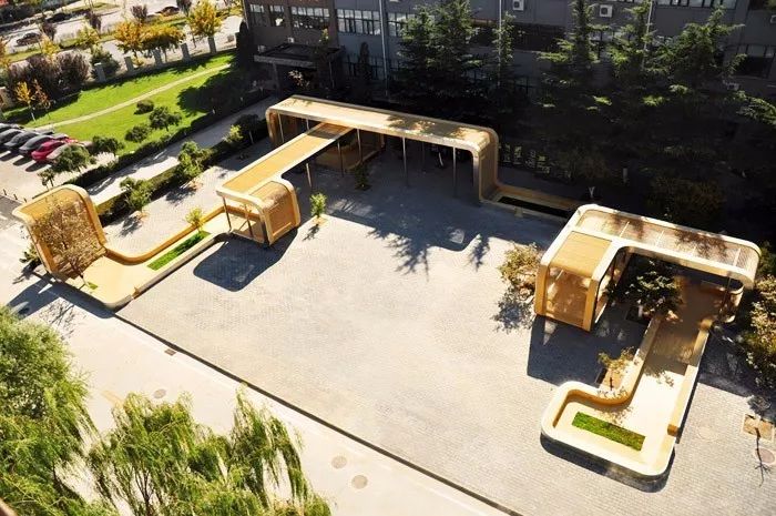 ▼“過山車”。位于北京黃莊職業(yè)高中文化廣場(chǎng)。