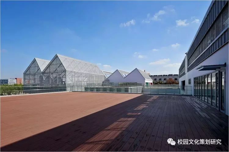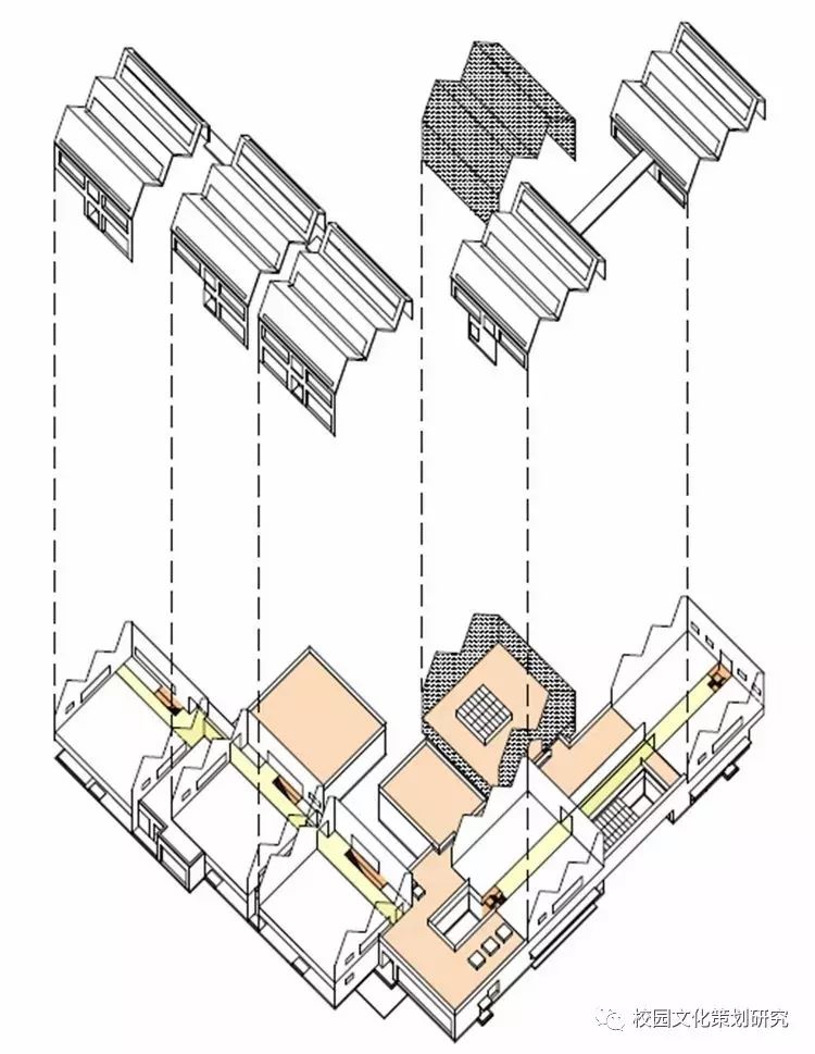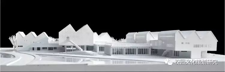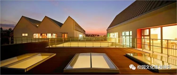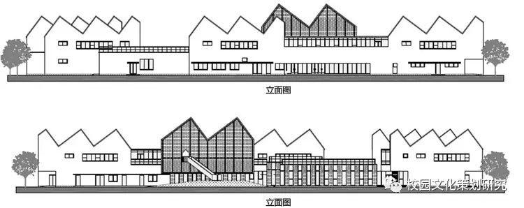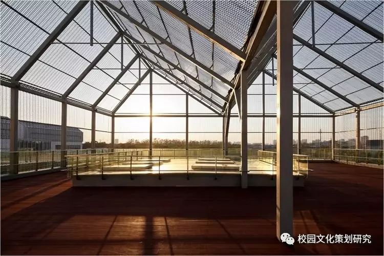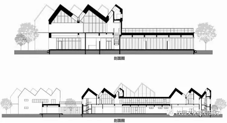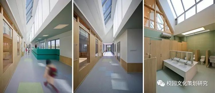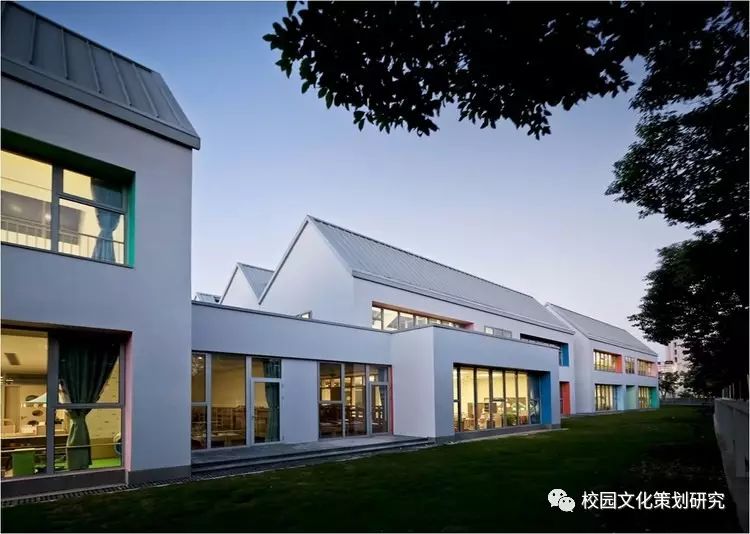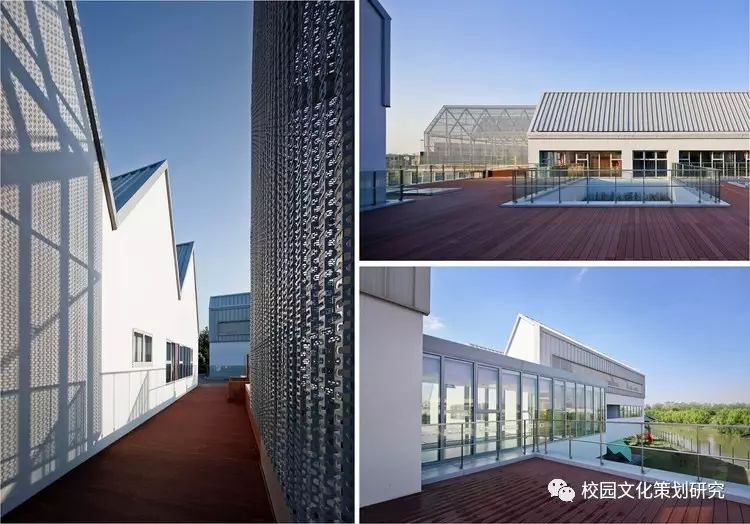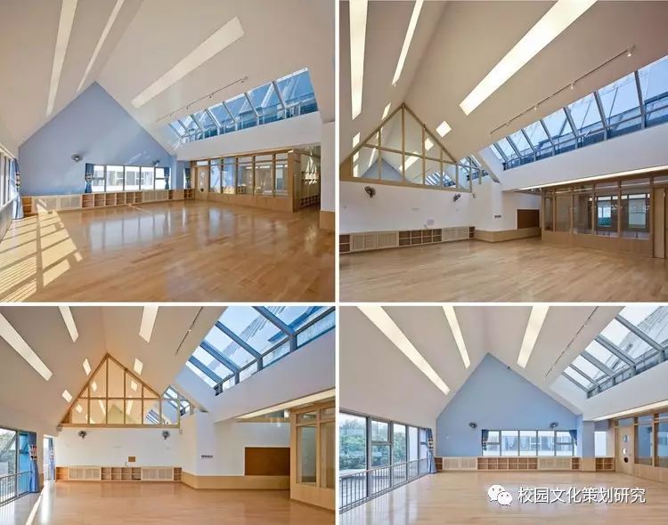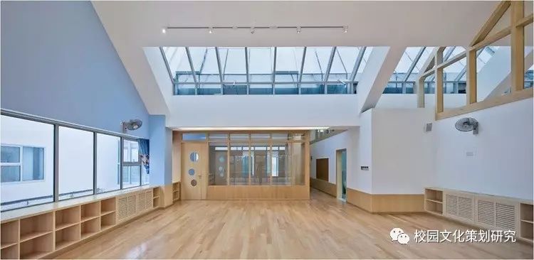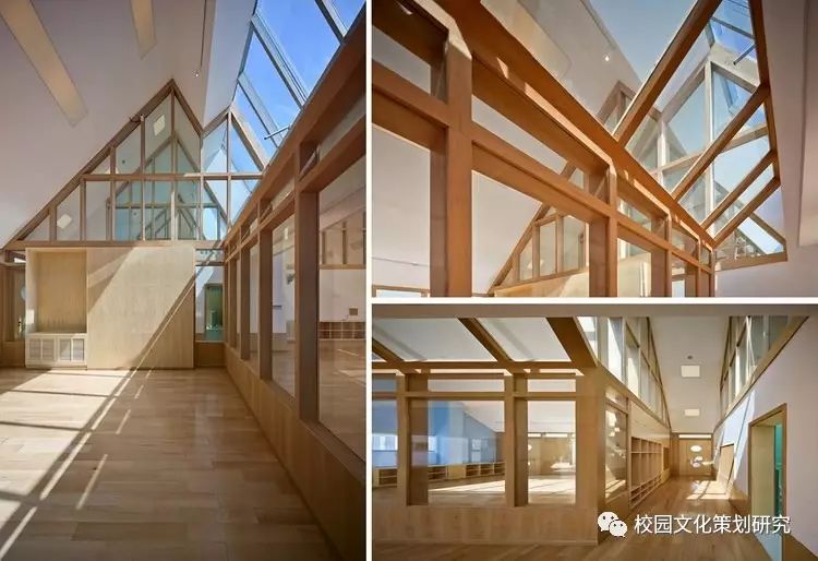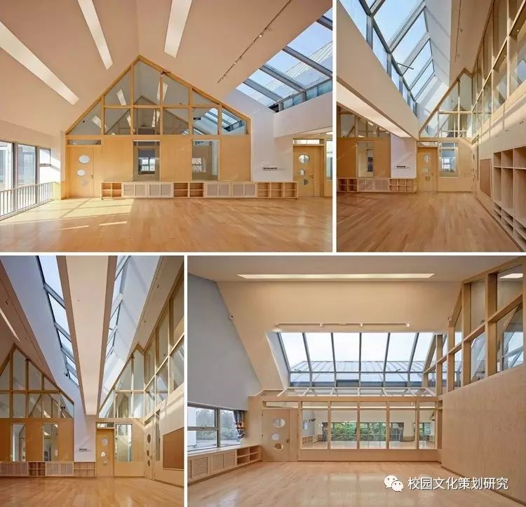 二層每個單元體都由配有居中內凹雙側天窗的連續(xù)坡折屋面覆蓋,并在北側的屋面內整合了空調及設備平臺。這樣的特殊設計使幼兒班及走廊內都高敞明亮,每一組雙坡屋面都對應了班內的活動室、臥室、或衛(wèi)生間,使幼兒在大進深的班級內部有一種居于屋檐下透過天窗光庭對望不同空間的屋頂和天空的奇特感受。