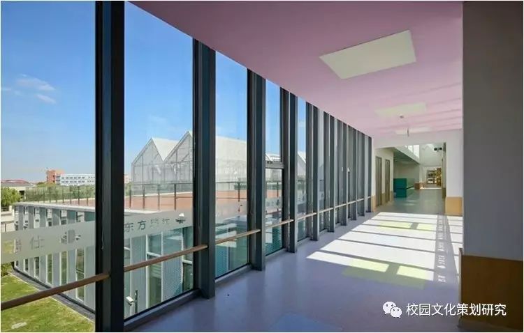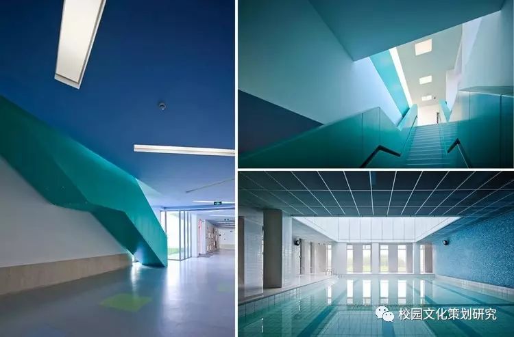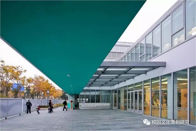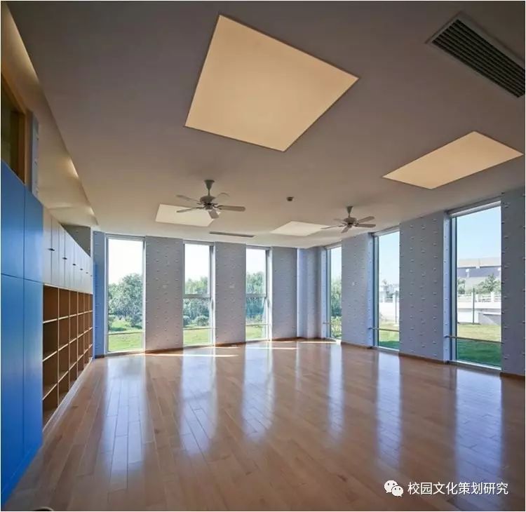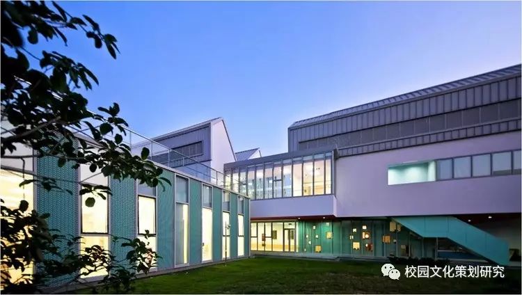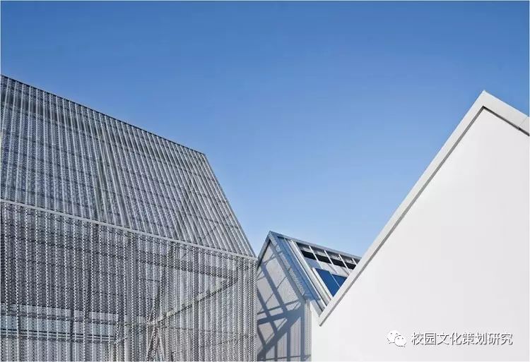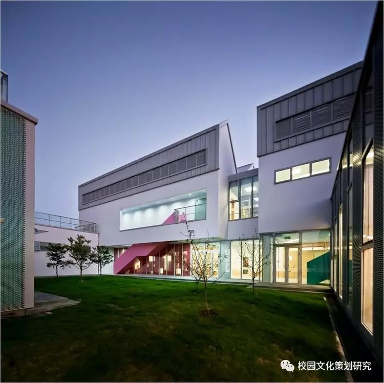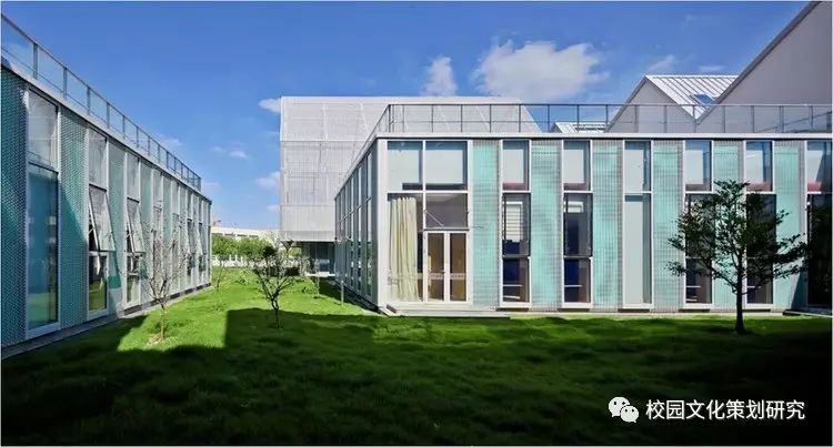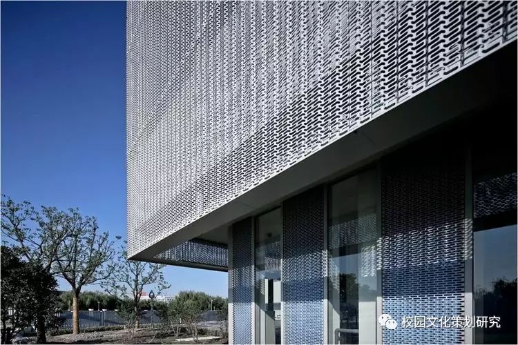 L形的主體由銀灰色的金屬屋面及涂料墻面組成輕盈的背景,各種營造水平視野的長窗帶、以及內凹窗帶洞口側邊的色彩處理成為立面上的認知重點。公共活動部分的豎向窗帶及其由穿孔鋁板包裹的彩色窗間墻共同營造了通透、柔和的效果,模糊了建筑體量和環(huán)境景觀的界限。