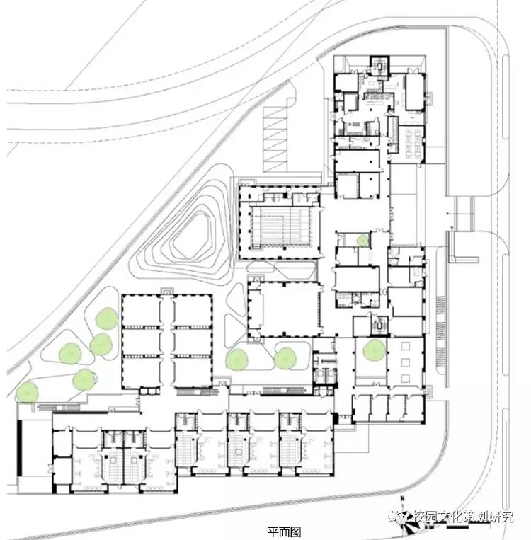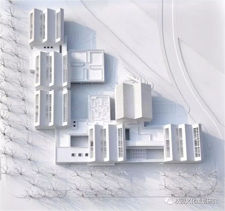 所有的公共活動空間,包括室內泳池、多功能活動室和六個專題活動室三部分,成為從主體量中向延河方向自由伸出的三個相對通透的單層體量,它們之間及外圍與河道之間形成一系列形態(tài)各異的綠化及活動庭院。三個體量層高各不相同,屋頂成為高低錯落的三個帶有綠化的活動平臺。