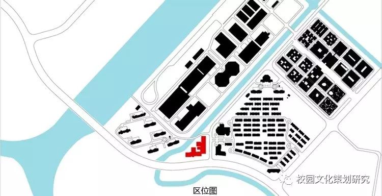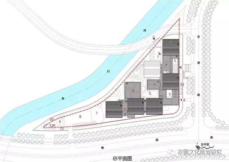 作為上海國際汽車城的教育配套項目,東方瑞仕幼兒園位于一塊兩側臨路,一側臨河的不規(guī)則三角形場地上,周邊分布有高標準的住宅區(qū)、研發(fā)機構和高爾夫度假酒店,基地東西兩側住宅區(qū)的跨河聯(lián)通道路在基地北角穿過。