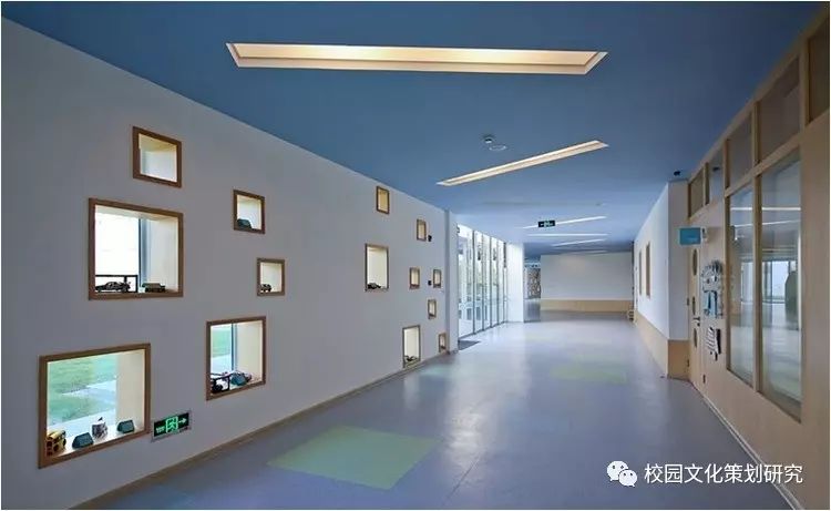 所有日托班、管理辦公、后勤等功能用房都分布在一個沿東、南兩側道路展開的相對規(guī)整的L形兩層體量中。底層由一條居于L形體量內側的蜿蜒寬大的長廊串聯(lián)托兒班級、辦公及后勤用房等空間。整個L形體量的底層成為一個基座平臺,二層的十個幼兒班是五個兩兩一組的單元體分布在基座上。