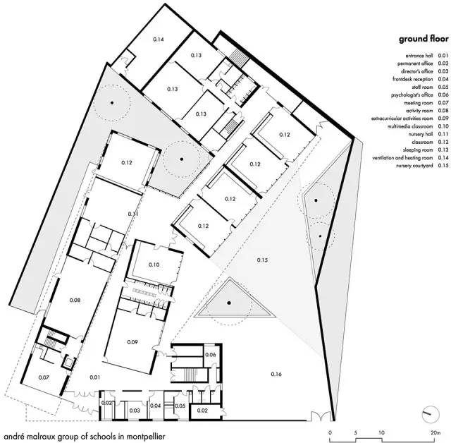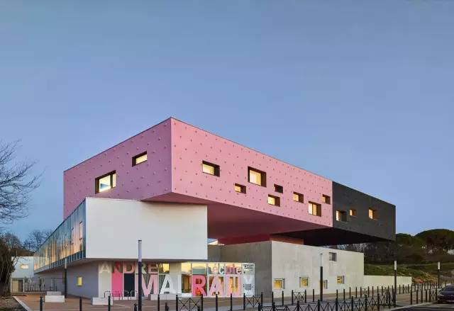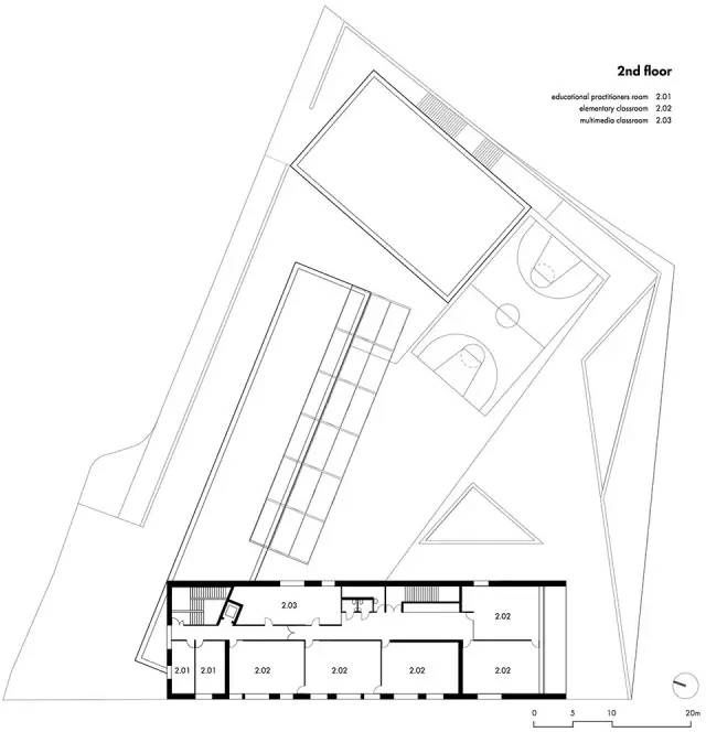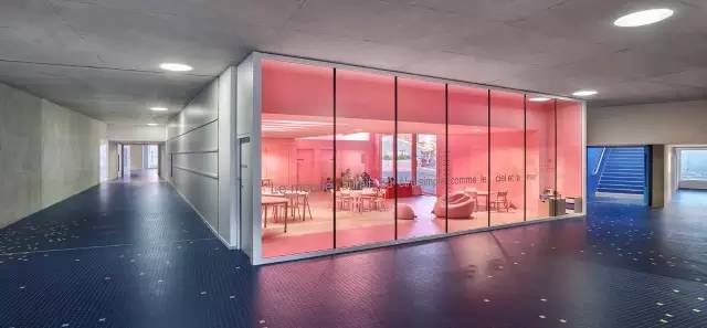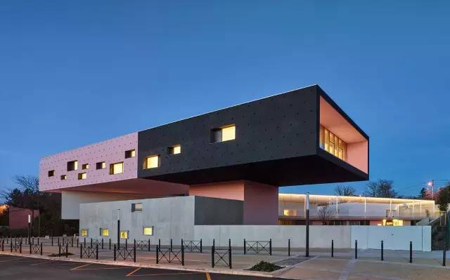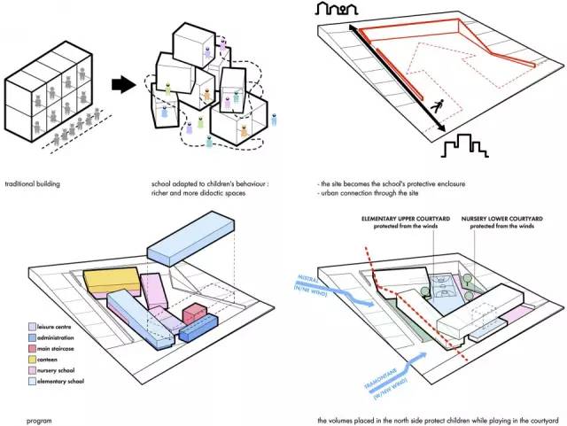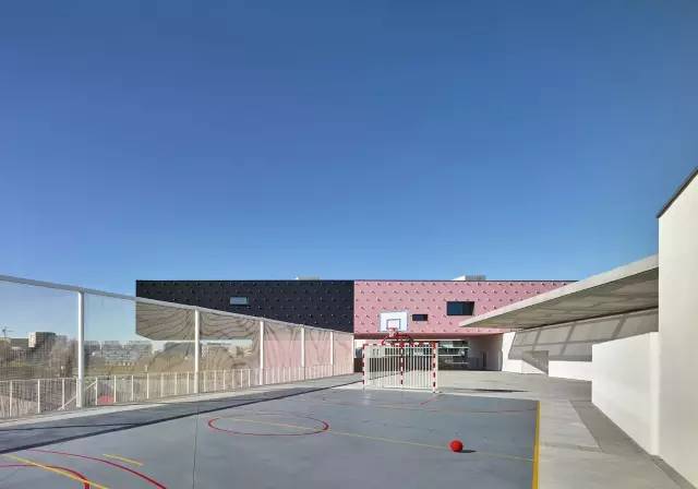 幼兒園和課余活動中心位于建筑的一層,可以從外側(cè)的活動場地直接進入課室。小學(xué)則占據(jù)了其上的兩層空間,而其室外活動場地恰恰利用了幼兒園的屋頂空間。顏色、材質(zhì)各不相同的數(shù)個體塊扭轉(zhuǎn)交錯,如積木般堆疊在一起,部分體量懸挑于活動場地之上,為孩子們遮擋風(fēng)雨和陽光。