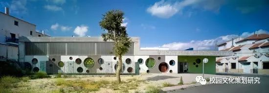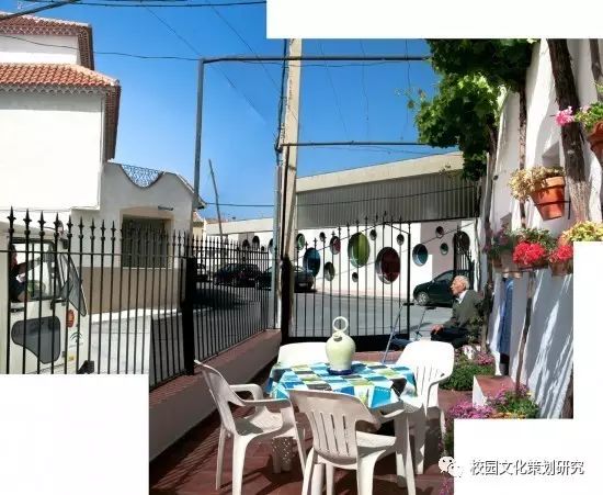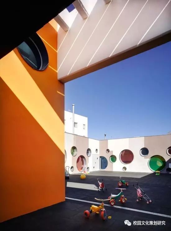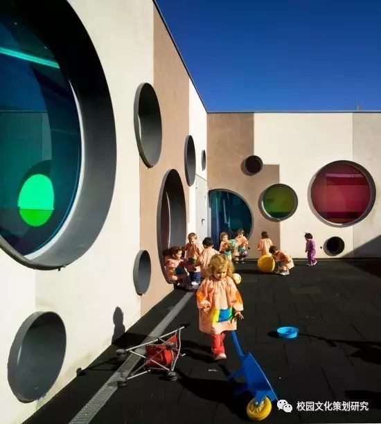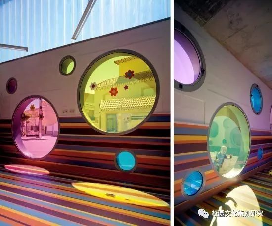 他們才不管這座彩色的建筑是不是與周圍的環(huán)境和諧,他們用自己的想象力來詮釋這座建筑,那些彩色的圓窗就像多彩的花盆懸掛在庭院的墻壁上。