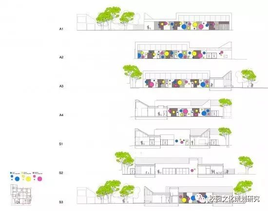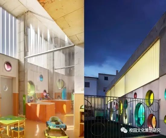 因此他們嘗試七巧板的拼圖方法并運(yùn)用到建筑的立面上,也就有了我們現(xiàn)在所看到的豐富的立面形式:各種色彩與大小的圓形窗,黃綠色、藍(lán)色、洋紅色的玻璃鑲嵌其中。