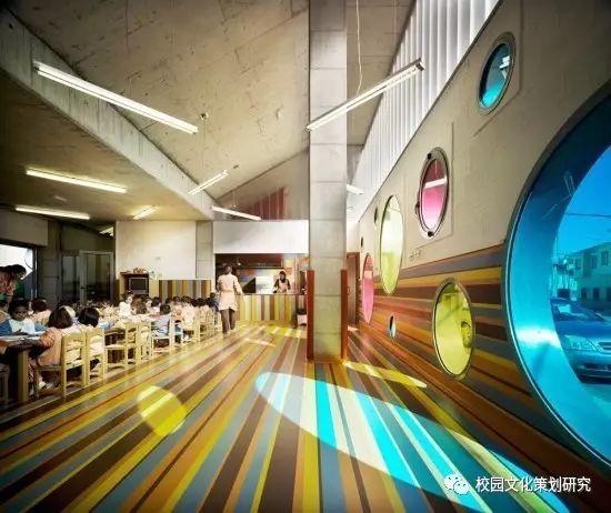 設(shè)計(jì)師將這個(gè)理念運(yùn)用在建筑的設(shè)計(jì)上。室內(nèi)的地面與墻裙采用彩色的塑膠板,三組年齡段的教室也以色彩來區(qū)分,色彩還用于劃分公共空間與教室空間。
