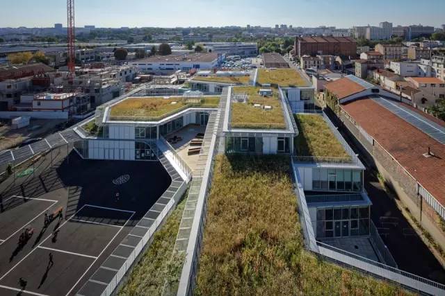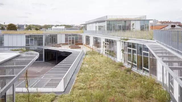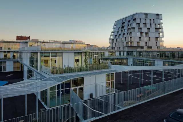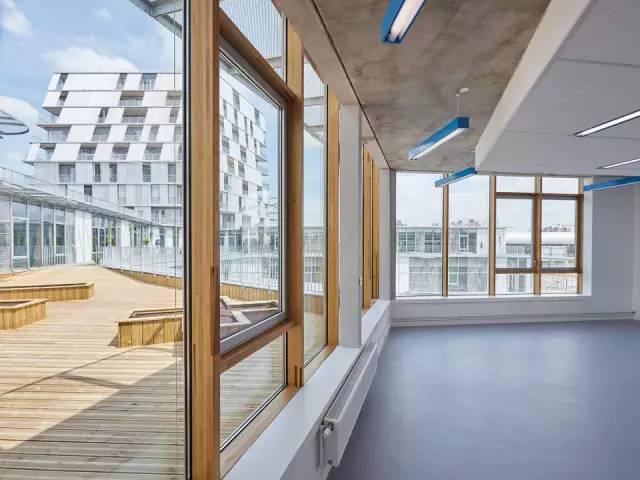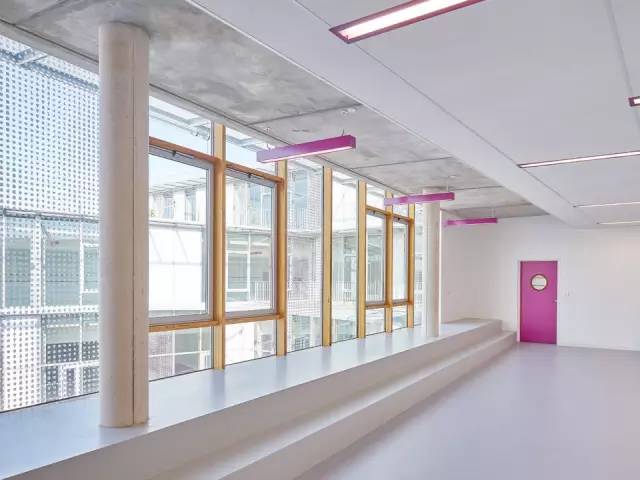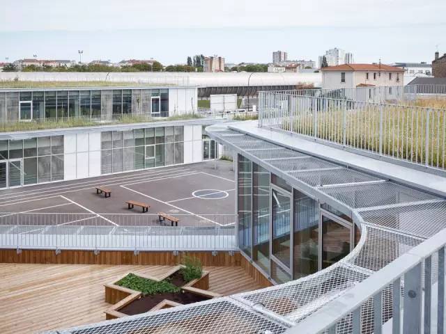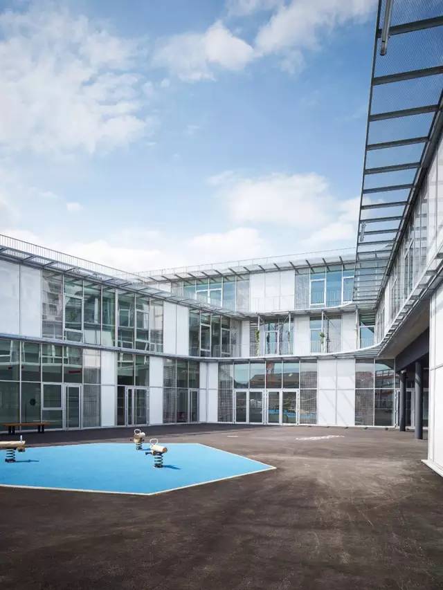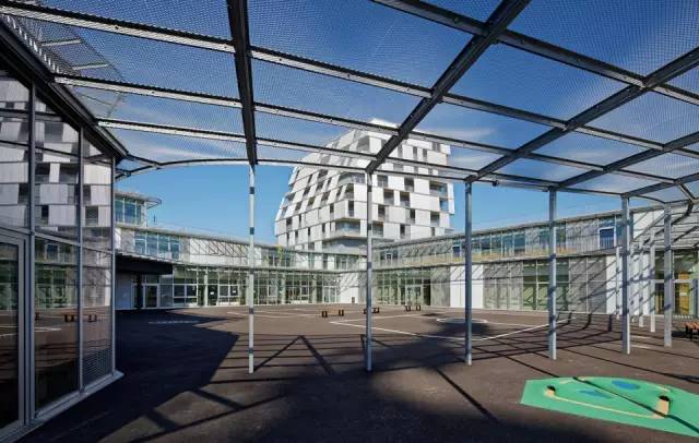 金屬遮陽(yáng)篷沿著教室的輪廓布置,在室內(nèi)外營(yíng)造統(tǒng)一的空間。室外通過(guò)半開放的毗鄰林蔭道路的操場(chǎng)相連接。這樣的設(shè)計(jì)是為了在操場(chǎng)和道路及周邊寓所(有的建筑高達(dá)7層)間設(shè)計(jì)一道屏障,同時(shí)在炎熱的夏季為操場(chǎng)遮陰。