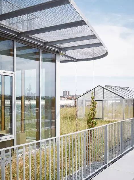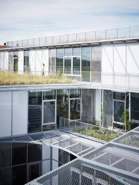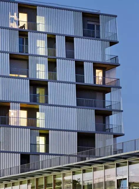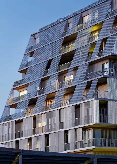 輕薄的立面由穿孔金屬板制成,彼此成角度地排布,有一部分向上傾斜。它們的作用是過(guò)濾來(lái)自街道行人的視線以及隔離早上和傍晚東西側(cè)低角度的光線。