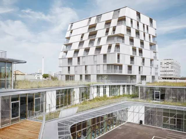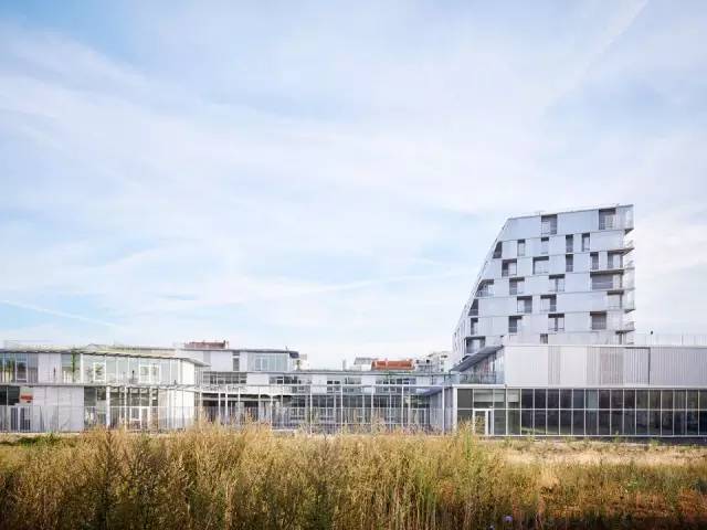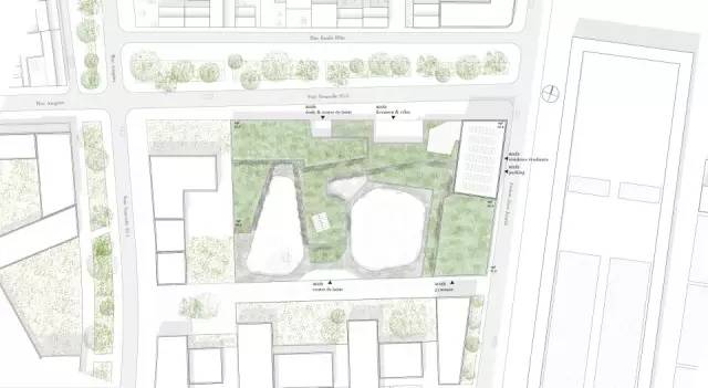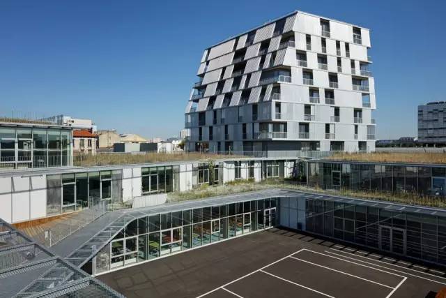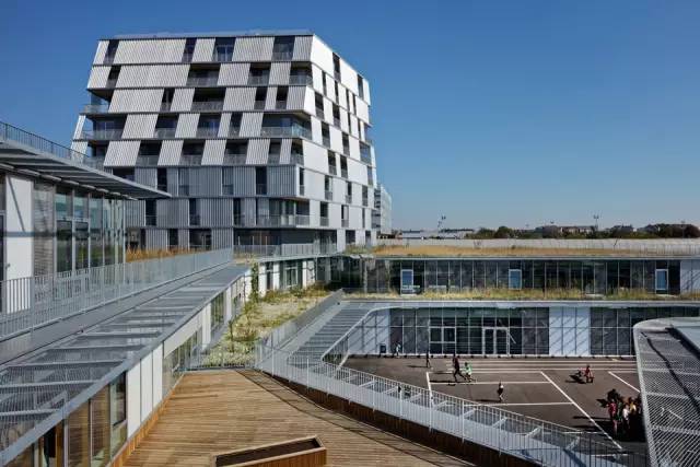 學(xué)生宿舍的設(shè)計(jì)基于4個(gè)主要建筑學(xué)原則。首先,項(xiàng)目作為一個(gè)整體要具有合理的功能(結(jié)構(gòu)和技術(shù)空間的疊加),同時(shí)還要緊湊。距離其他功能分區(qū)的距離使它有所脫節(jié),具有一定的獨(dú)立性。由于宿舍區(qū)被設(shè)置在盡可能北的方位,最窄的立面朝向Jean-Jaurès大街,平臺(tái)不會(huì)阻擋陽(yáng)光進(jìn)入室內(nèi)。這也保證了操場(chǎng)能夠享受足夠多的陽(yáng)光。