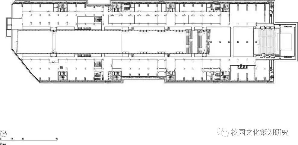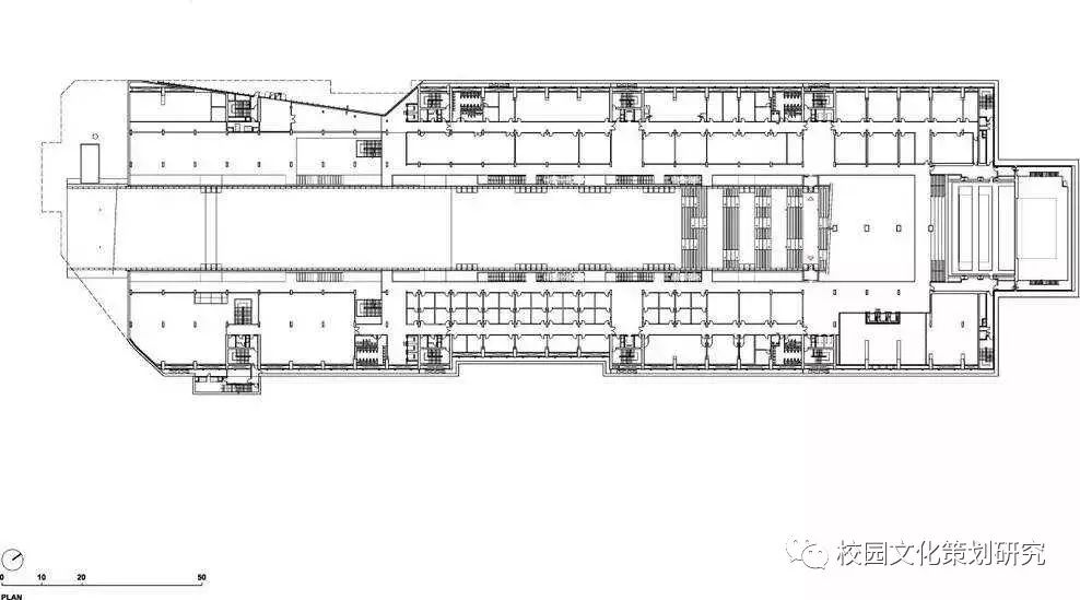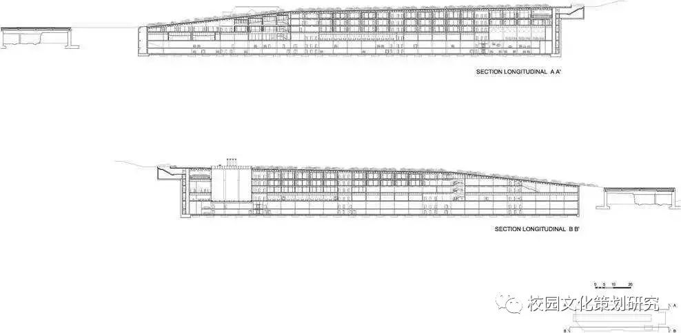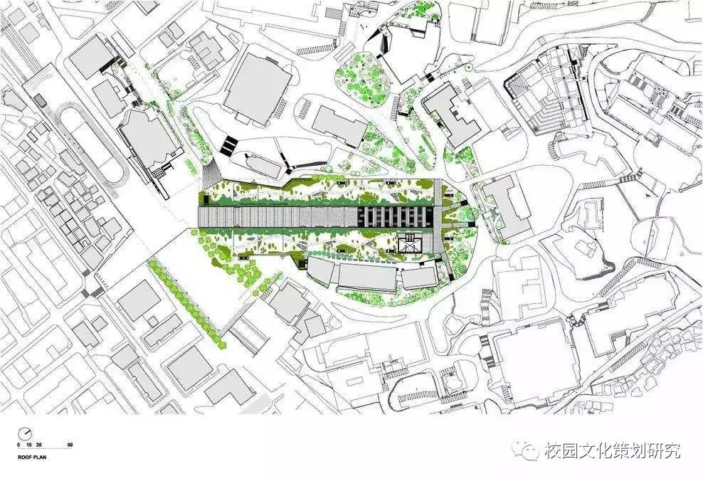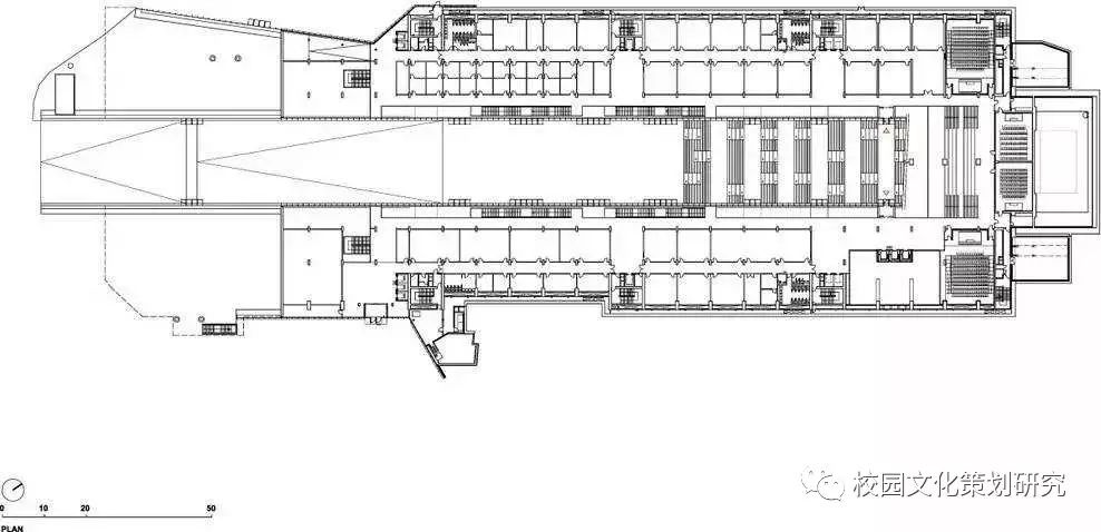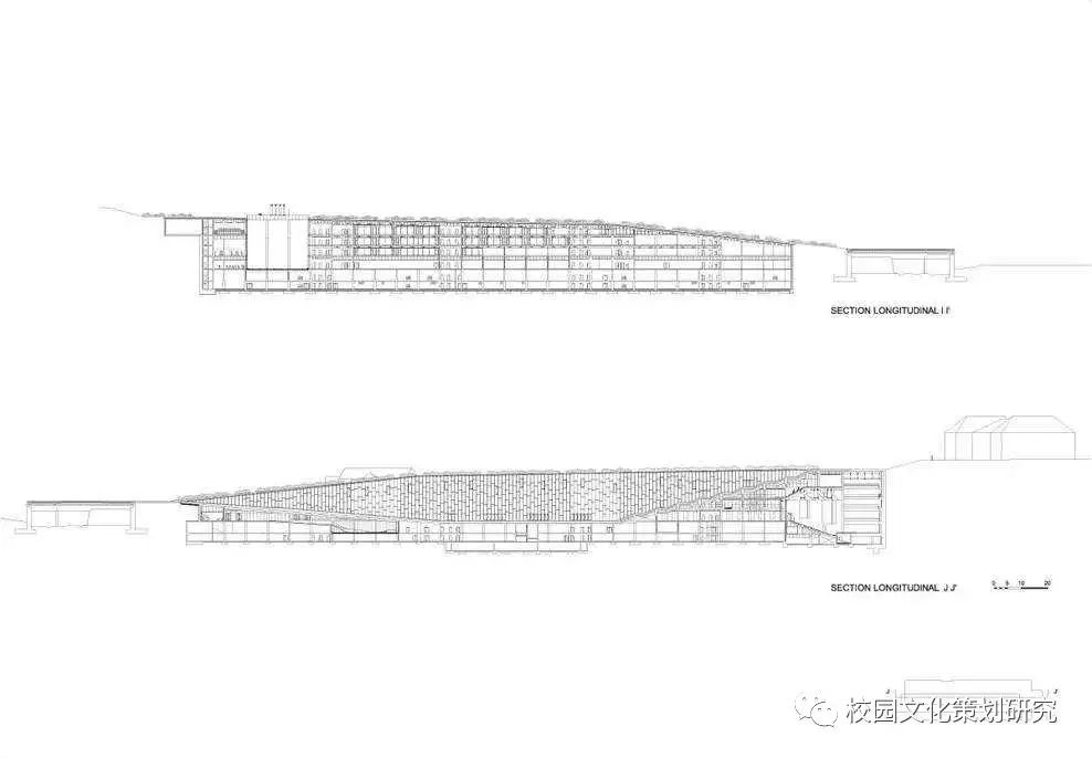 長(zhǎng)長(zhǎng)的瀝青道路被大自然景觀圍繞,黑色瀝青、紅色跑道、綠色自然和山谷互相融合。校園由兩個(gè)夾著很長(zhǎng)的多功能廣場(chǎng)線性建筑構(gòu)成,廣場(chǎng)不僅可以用來(lái)做講座,舉辦大型活動(dòng),還是很好的休閑娛樂(lè)空間,這樣的建筑結(jié)構(gòu)不僅減少了建筑的占地面積,還有利于自然光的入滲。