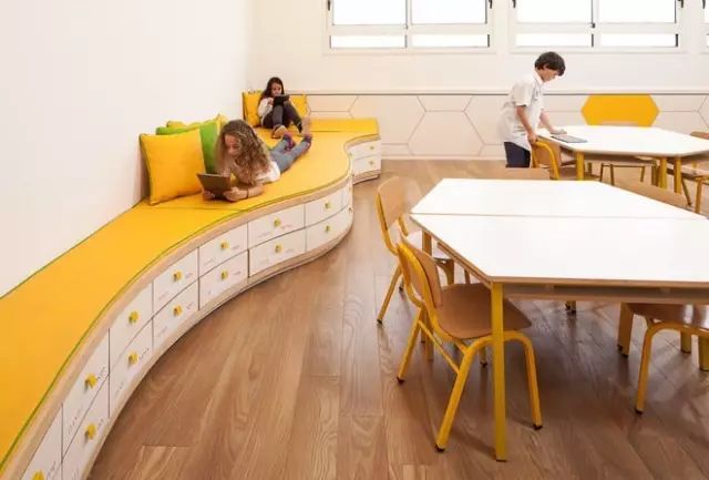 靠墻的弧形邊柜可坐可躺,給小朋友很多自由和舒適…這些設(shè)計(jì)都是為了減少對(duì)孩子的束縛,增強(qiáng)他們的交流和碰撞,這些就是創(chuàng)造的基礎(chǔ)!