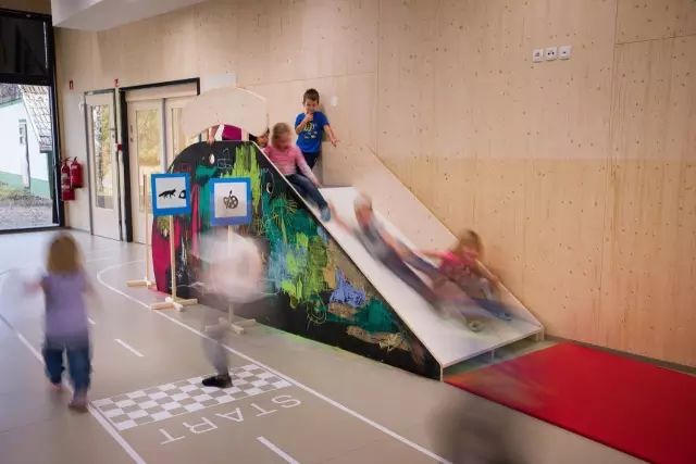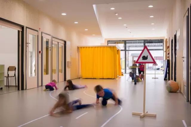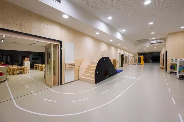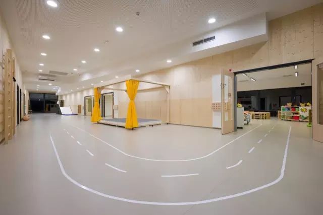 學(xué)校利用設(shè)計(jì)元素,引導(dǎo)孩子積極參與活動(dòng),做到身心健康。游戲室之間有條彎曲的小路,視覺(jué)上它連接了不同的空間,并引導(dǎo)孩子跟隨它(散步,慢跑,騎踏板車或自行車)。