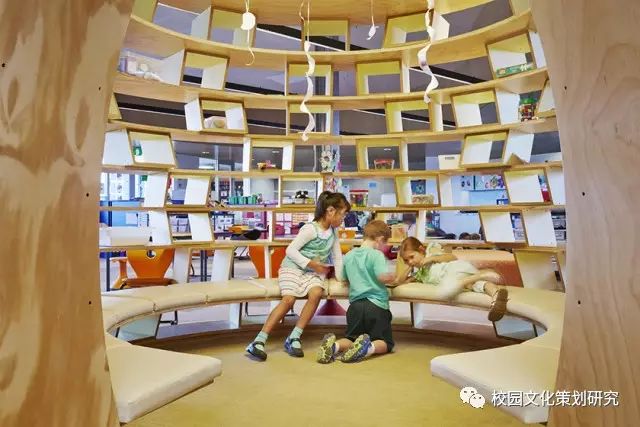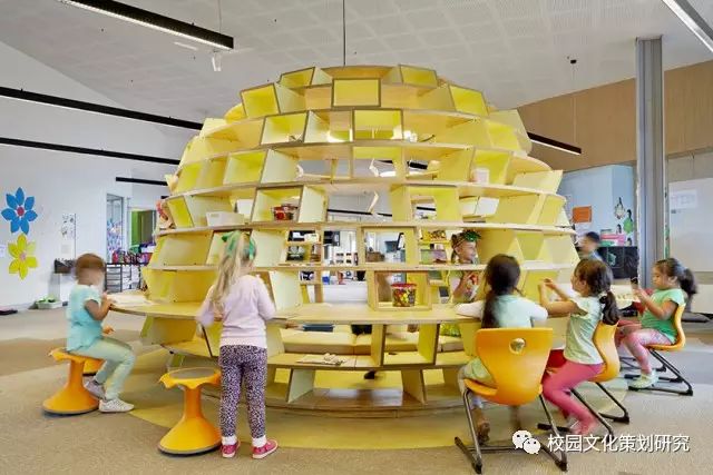 里面的座位為孩子們提供了“隱蔽的空間”,可以用來(lái)進(jìn)行討論、玩游戲,或者只是在這里做功課。在“蜂巢”頂部開(kāi)口有個(gè)圓形熒光燈,照明極佳。不同顏色的地毯也為“蜂巢”劃定“特殊”區(qū)域。