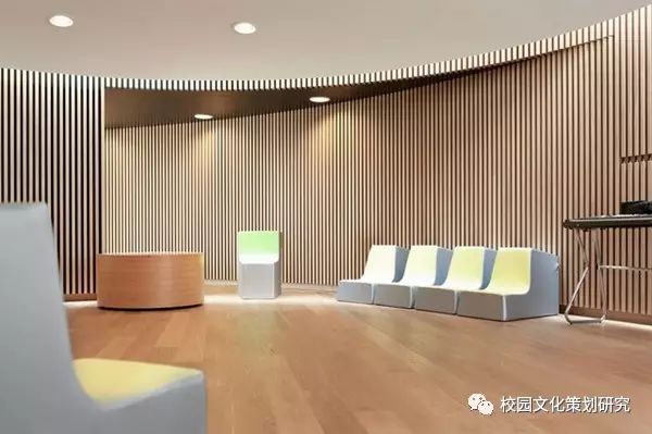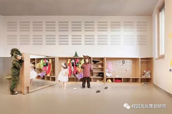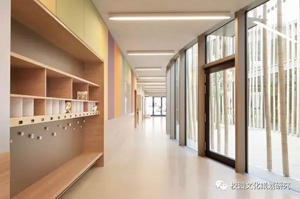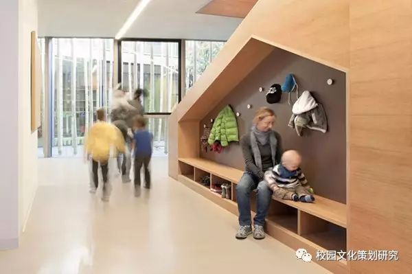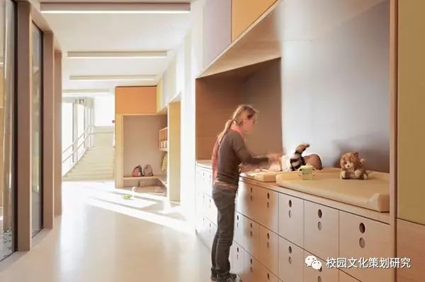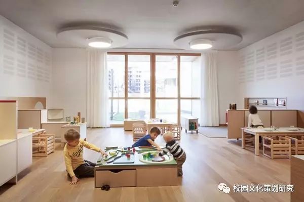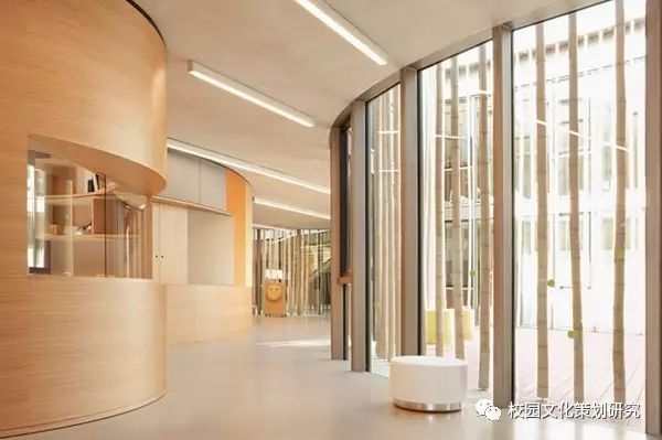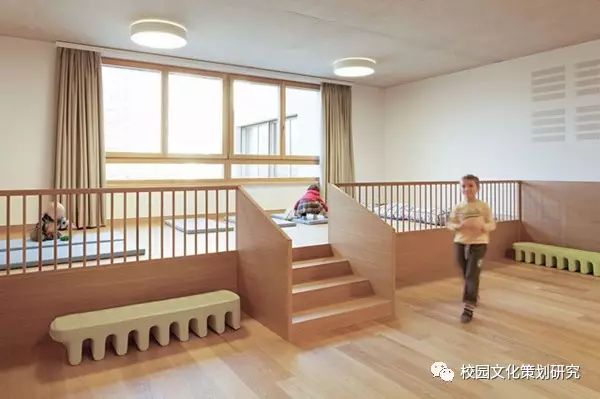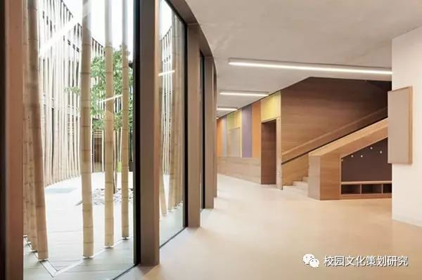 內(nèi)部?jī)傻老嗷ソ豢椀那€構(gòu)建出建筑內(nèi)部的景觀庭院,作為孩子們活動(dòng)場(chǎng)地的同時(shí),讓整個(gè)建筑中庭充滿了陽(yáng)光。內(nèi)部大多采用了木質(zhì)的墻裙,地面與家具,看上去整潔干凈,非常利于兒童活動(dòng)。