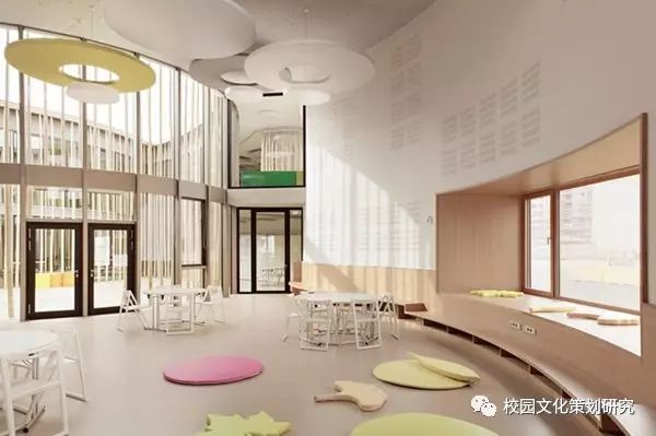 兩所學(xué)校共同裝配了一個(gè)大的食堂,位于地下一層,作為食物供給中心。當(dāng)?shù)氐某鞘泄芾碚咭庾R(shí)到新建的兩所校園建筑在全市范圍內(nèi)與周邊居民構(gòu)建一個(gè)新的鄰里關(guān)系存著不小的挑戰(zhàn),所以校方與政府共同努力,希望校園可以成為周邊居民的一個(gè)聚集點(diǎn),加強(qiáng)校方與居民的溝通聯(lián)系與交流。從曲線形幼兒園的空間布局可以看出,內(nèi)部的共享空間專門劃出一塊作為Family Center。