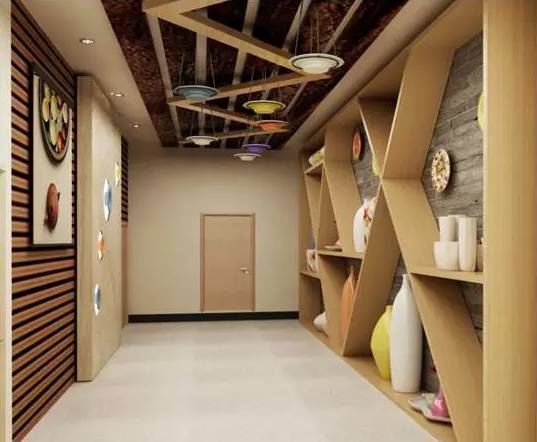 陶藝室走廊。整體采用暖色調(diào),磚石的紋理與原木色的搭配,形成了古樸的質(zhì)感,與陶藝典雅大氣的特點有了很好的映照,展示架可以展出師生優(yōu)秀作品,增加了個人實踐展示的空間。