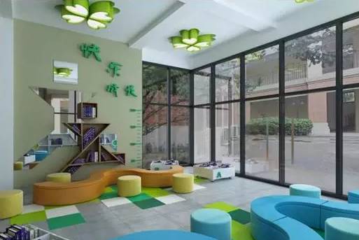 書畫手工藝中心,通過懸掛優(yōu)秀藝術(shù)作品,起到學習導向作用;儲藏柜的設計,增加儲物空間;地板上腳丫形狀的人流警示標志,溫馨有趣。