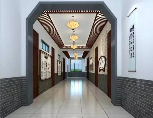 文源國學館走廊。青磚白墻、扇面裝飾、線型流暢優(yōu)美的吊燈,完美契合了國學館的定位。
