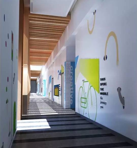 師生活動中心走廊。整個走廊以生氣勃勃的綠色為主,呈現(xiàn)出朝氣蓬勃的感覺,很符合活動中心的的空間定位。