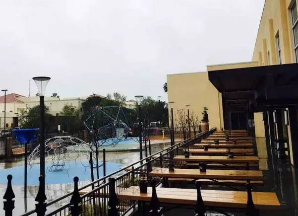 天好的時候,在加州就是大部分時候,孩子們在戶外餐桌上吃飯。戶外的攀爬架設計的有點反傳統(tǒng),看似有還那么點小危險,但卻讓無論多大年紀的人看到都感覺有點蠢蠢欲動。其實,可控的風險以及有機會讓孩子學會摔倒和自我保護才是戶外體能設施的最佳標準,畢竟不是幼兒園過家家的器材。