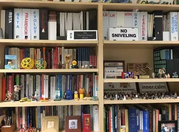 在等Larry回來的時候,我像柯南一樣掃視著他的辦公室,滿的幾乎要溢出來的墻上沒有那些裝模作樣的獎杯錦旗,有比爾蓋茨、拳王阿里以及其他名人的來訪照片,但更多的是學生的照片和被“扣押”下來的學生作品,一些睿智而風趣的圖片或文字,有些分明代表Larry的個性和HTH的風格,比如馬克杯上印的Be Creative through Non-Compliance,沙發(fā)墊上寫著There Were Rules?