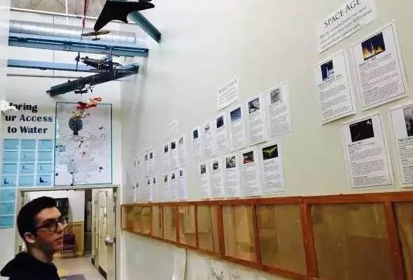 HTH的高中部是一幢平層樓,助理Cindy姐在門口朝我熱情招手。一進門馬上被眼前的畫面打動,你的視線瞬間被挑高10米的教學樓調(diào)成30-45度仰角。完全不像一個學校,更像個工廠車間、創(chuàng)業(yè)公司、博物館或美術館,眼睛一時不知道在哪里落腳,因為整個三度空間全部用來展示學生們的作品。