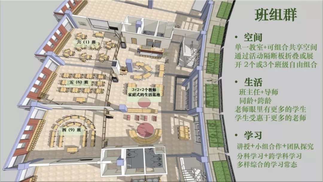 變化最大的還有學校組織模型。新校區(qū)一共有4個“校中校”,每個校中校有16個“班組群”,每個班組群里有3個不分年級的班。每個班組群就是一個家庭式的學習生活基地,有獨立的衛(wèi)生間、樓梯間以及共享空間,還有不同學科的七八位教師以及上百名學生。我們以此引導師生進行交往方式的變革、教學組織形式的變革,促進形成新型的伙伴學習關系。