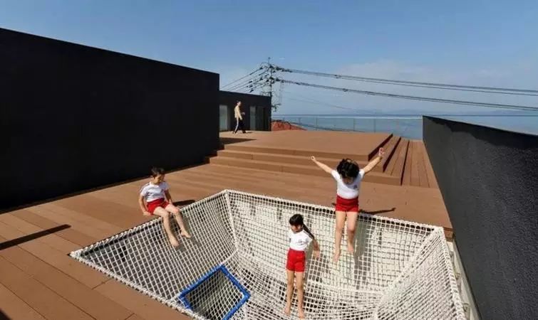 同樣地,它也沒有花哨的色彩。這里可供孩子們玩耍的地方看上去天然而又樸素:通過攀爬繩索,孩子們可以抵達樓頂?shù)穆杜_,吹著海風(fēng),無拘無束地度過愉快的童年時光。