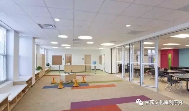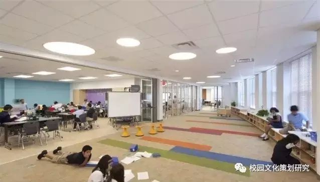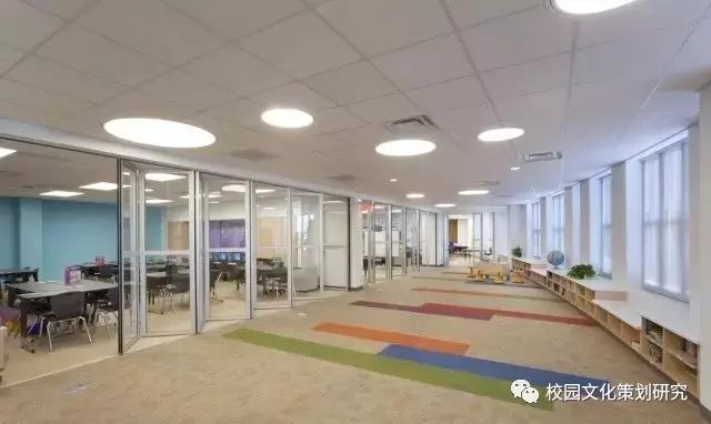 形成三個(gè)開放學(xué)習(xí)組團(tuán)。沿著實(shí)驗(yàn)室和學(xué)習(xí)資源區(qū)形成的中軸線兩側(cè),引入開放、互動(dòng)和基于項(xiàng)目學(xué)習(xí)的設(shè)計(jì)理念,分別規(guī)劃設(shè)計(jì)了三個(gè)“三間教室一個(gè)交流區(qū)”的學(xué)習(xí)組團(tuán)。普通教室戶型方正,臨近共享交流區(qū)的一側(cè),拋棄了傳統(tǒng)實(shí)體墻的常規(guī)設(shè)計(jì)思路,引入了活動(dòng)屏風(fēng)隔斷,從而在開放、共享與隔離控噪之間實(shí)現(xiàn)了靈活組合,方便師生基于不同學(xué)習(xí)科目與知識(shí)的需要,靈活配置學(xué)習(xí)空間。