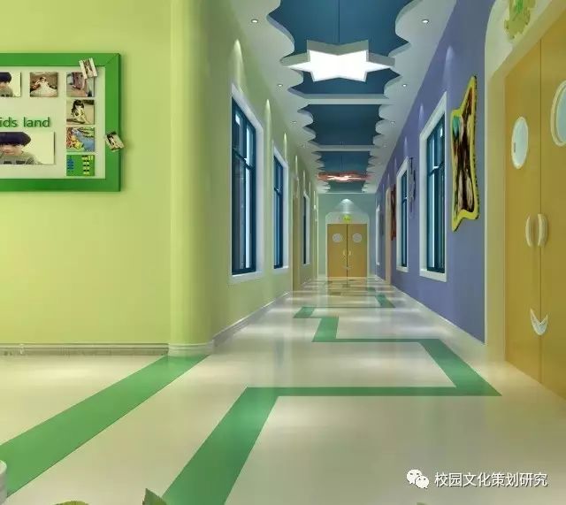 為了迎合兒童活潑好動(dòng),天真的心理,在幼兒園走廊設(shè)計(jì)中會(huì)結(jié)合故事性或者利用卡通主題來加以設(shè)計(jì),通過吊頂、墻面、結(jié)合地面來打造整體感覺。上圖中的幼兒園走廊由藍(lán)色做主色,適當(dāng)添加淡藍(lán)和草黃作為輔助,讓整個(gè)空間充滿了蔚藍(lán)的星空感,又能有海底世界的清新味道,使其能夠充分符合兒童的天性,讓小朋友在這里能夠感受到快樂。同時(shí)還將其作為展示空間來設(shè)計(jì),墻壁上多樣化的造型模板排列組合,上面可以展示小朋友的作品和師生風(fēng)采,并且展示內(nèi)容可以隨時(shí)更換,人性化特色令人心生向往。