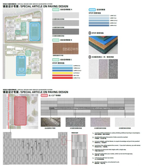 根據(jù)功能不同,結(jié)合建筑外觀,校園各區(qū)域地面采用不同的鋪裝形式,主要有青石板、花崗巖(磨光、火燒板)、條形廣場(chǎng)磚、條形步石、木質(zhì)鋪裝、卵石步道等。其中木質(zhì)鋪裝,是用原木材進(jìn)行加工的地面材料,顯現(xiàn)出天然的紋理和木材的清香,富有韌性,踩著舒適,校園使用度高。