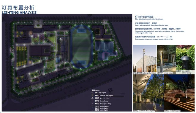 以主軸為中心,突出軸線(xiàn)和主景,感受環(huán)境主體小品和建筑主體的幾何結(jié)構(gòu),激發(fā)孩子們對(duì)空間結(jié)構(gòu)有更深的了解。除教學(xué)樓外,對(duì)于孩子們?cè)谝归g經(jīng)常出現(xiàn)的場(chǎng)所,都配以適合亮度和顏色的燈光,如籃球場(chǎng)、排球場(chǎng)等,加強(qiáng)孩子們校園活動(dòng)的安全性。